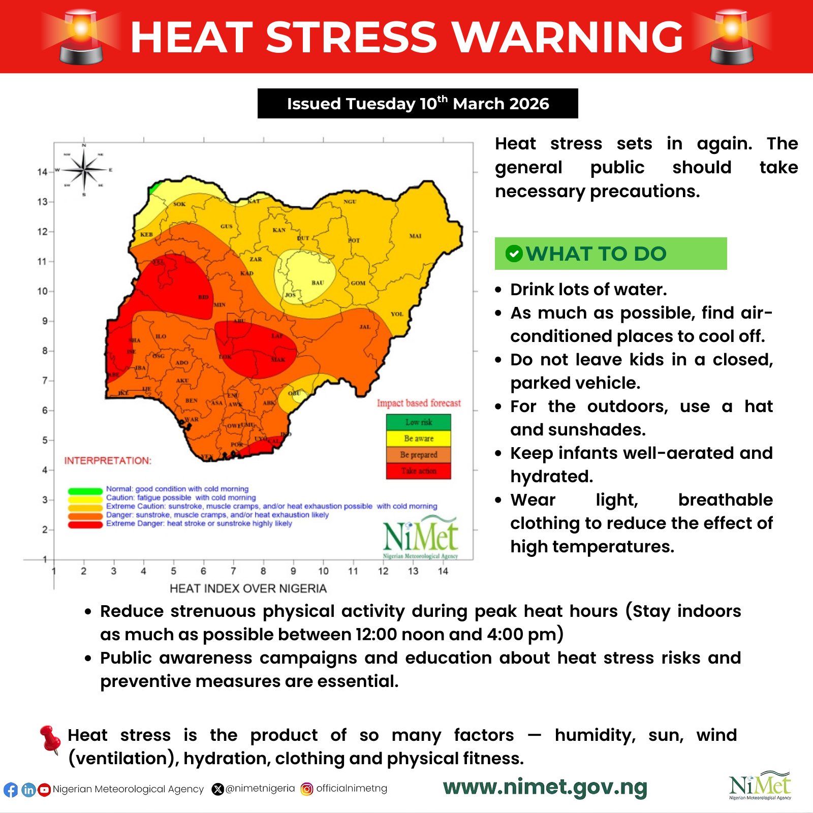 NiMet noted that heat stress can occur due to a combination of factors including high temperatures, humidity, poor ventilation, dehydration, clothing and physical exertion.